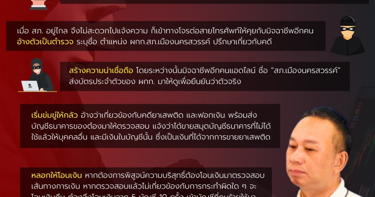 ระหว่างนั้น มิจฉาชีพคนที่ 3 ใช้บัญชีไลน์ ชื่อ “สภ.เมืองนครสวรรค์” ส่งบัตรประจำตัว พ.ต.อ.เสฎฐวุฒิ รอดจันทร์ มาให้ดูและแจ้งด้วยว่า นายวัฒนาฯ เกี่ยวข้องกับคดียาเสพติดและฟอกเงินพร้อมส่งบัญชีธนาคารของนายวัฒนาฯ มาให้ตรวจสอบและแจ้งว่าได้ขายสมุดบัญชีธนาคารที่ไม่ได้ใช้แล้วให้บุคคลอื่นในราคา 50,000 บาท และมีเงินจำนวน 850,000 บาท ซึ่งเป็นเงินที่ได้จากการขายยาเสพติดโอนเข้ามาในสมุดบัญชี หากต้องการพิสูจน์ความบริสุทธิ์ต้องโอนเงินมาตรวจสอบเส้นทางการเงิน หากตรวจสอบแล้วไม่เกี่ยวข้องกับการกระทำผิดใดๆ จะโอนเงินคืน นายวัฒนาฯ หลงเชื่อจึงโอนเงินจากบัญชีธนาคาร 5 บัญชี จำนวน 10 ครั้ง เข้าบัญชี น.ส.สุดารัตน์ (ขอสงวนนามสกุล) และ น.ส.ชนกานต์ (ขอสงวนนามสกุล) รวมเป็นเงิน 3,202,380.7 บาท ให้มิจฉาชีพไป