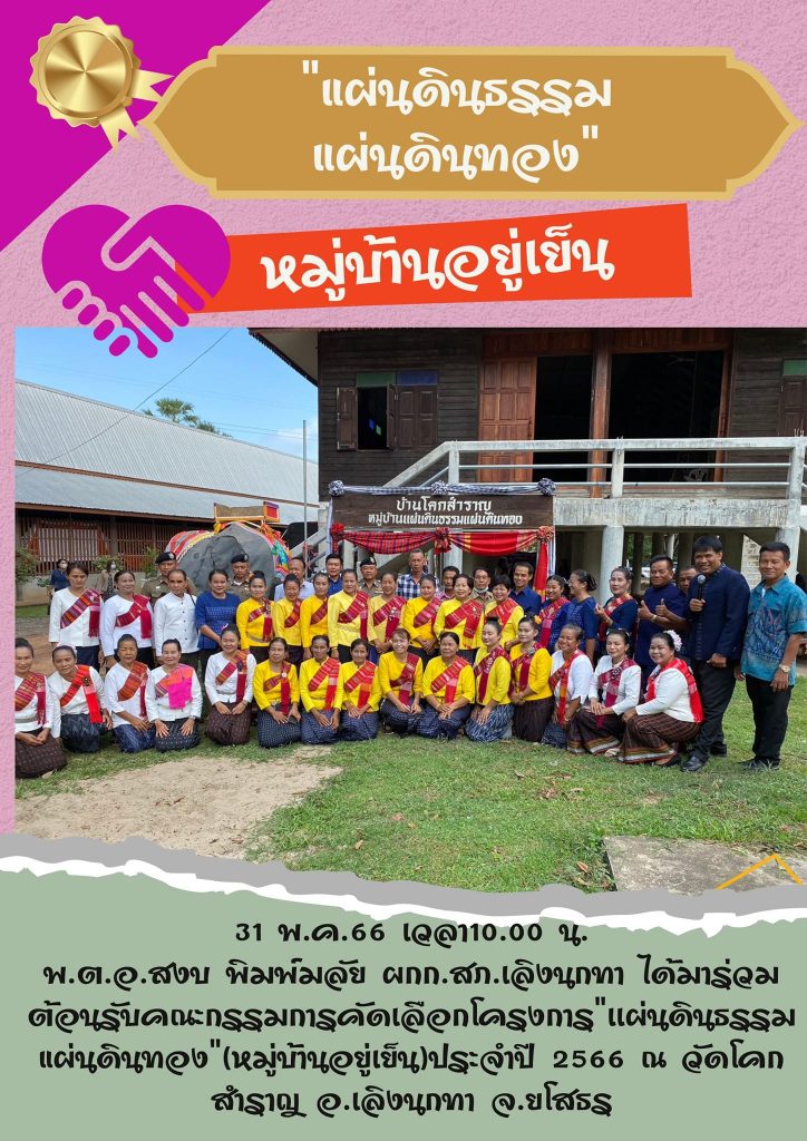 พ.ต.อ.สงบ พิมพ์มลัย ผกก.สภ.เลิงนกทา ได้มาร่วมต้อนรับคณะกรรมการคัดเลือกโครงการ”เเผ่นดินธรรมแผ่นดินทอง”(หมู่บ้านอยู่เย็น)ประจำปี 2566 ณ วัดโคกสำราญ อ.เลิงนกทา จ.ยโสธร
