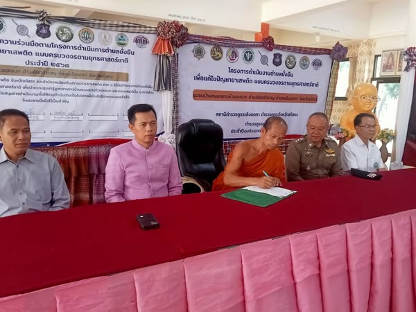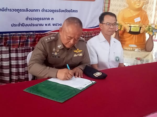 โดยมี พ.ต.อ.สงบ พิมพ์มลัย ผกก.สภ.เลิงนกทา หัวหน้าส่วนราชการระดับอำเภอ ผู้บริหารองค์กรปกครองส่วนท้องถิ่น ผู้บริหารสถานศึกษา กำนัน ผู้ใหญ่บ้านและประชาชนในพื้นที่ ร่วมโครงการ ณ ศาลาการเปรียญวัดเขมิยาราม บ้านหนองยาง ตำบลโคกสำราญ อำเภอเลิงนกทา จังหวัดยโสธร