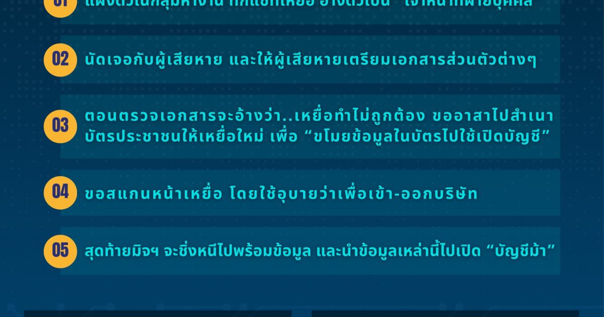 นัดเจอกับผู้เสียหาย โดยแอบอ้างเป็นตัวแทนบริษัทต่างๆ เพื่อแจ้งให้ผู้เสียหายเตรียมเอกสารประจำตัว โดยใช้ข้อมูลที่ได้ นำไปเตรียมเปิดบัญชีแบบออนไลน์