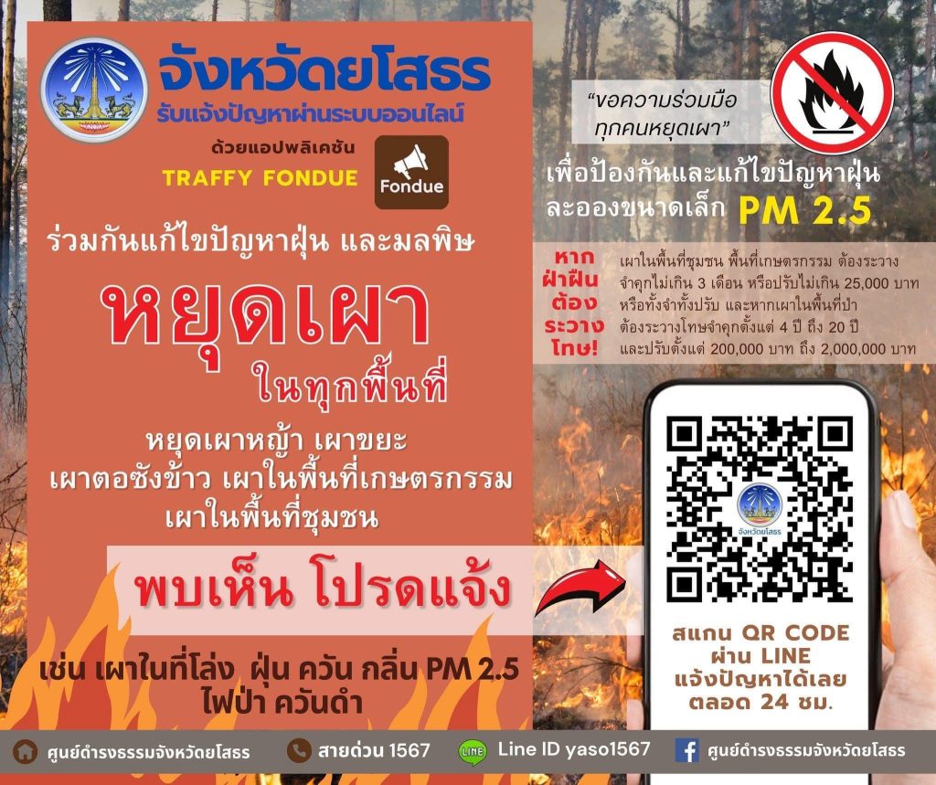 จังหวัดยโสธรรับแจ้งปัญหาผ่านระบบออนไลน์ด้วยแอพพลิเคชั่น TRAFFY FONDUE ร่วมกันแก้ไขปัญหาฝุ่น และมลพิษ หยุดเผาในทุกพื้นที่