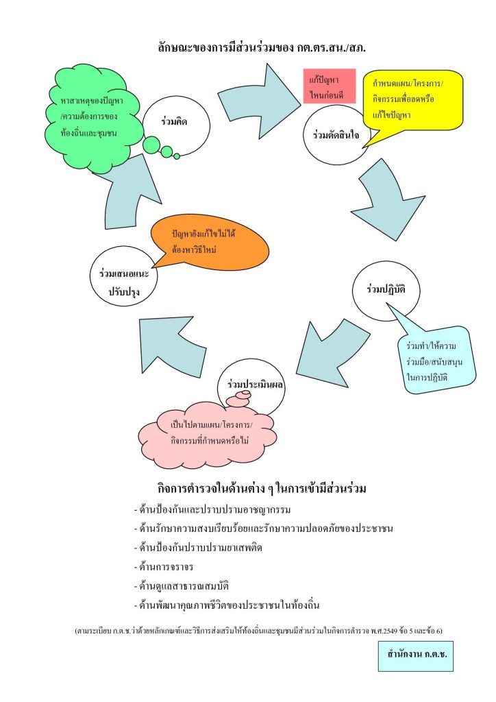 (2) คณะกรรมกรตรวจสอบและติดตามการบริหารงานตำรวจกรุงเทพมหานคร เรียกโดยย่อว่า กต.ตร.กทม. และคณะกรรมการตรวจสอบและติดตามการบริหารงานตำรวจจังหวัด เรียกโดยย่อว่า กต.ตร.จังหวัด ต่อมาคณะกรรมการตรวจสอบและติดตามการบริหารงานตำรวจแห่งชาติ ( กต.ตร. ) ได้ออกระเบียบ กต.ตร.ว่าด้วยหลักเกณฑ์และวิธีการแต่งตั้งคณะกรรมการระดับสถานีตำรวจ พ.ศ. 2543 กำหนดให้มีคณะกรรมการตรวจสอบและติดตามการบริหารงานระดับสถานีตำรวจในสังกัดกองบัญชาการตำรวจนครบาลและตำรวจภูธรภาค 1 ถึง9 เรียกโดยย่อว่า “กต.ตร.สถานีตำรวจ” และตามข้อ 10 ของระเบียบดังกล่าวได้ให้อำนาจสำนักงานตำรวจแห่งชาติกำหนดหลักเกณฑ์และวิธีการแต่งตั้งคณะกรรมการหน่วยงานอื่นในระดับเดียวกับสถานีตำรวจซึ่งมีหน้าที่รับผิดชอบเกี่ยวข้องกับการรักษาความปลอดภัยในชีวิตและทรัพย์สินของประชาชนและการให้บริการแก่ประชาชน ซึ่งได้แก่ ตำรวจทางหลวง ตำรวจท่องเที่ยวและตำรวจรถไฟ ในปี พ.ศ. 2547 ได้มีการตรา พ.ร.บ.ตำรวจแห่งชาติ พ.ศ. 2547 ขึ้นเพื่อเป็นกฎหมายบริหารราชการตำรวจ ตามกฎหมายนี้มีบทบัญญัติที่ให้ประชาชนมีส่วนร่วมในการบริหารงานตำรวจ ตามเจตนารมณ์ของรัฐธรรมนูญดังกล่าวข้างต้นไว้อย่างชัดเจน โดยกำหนดไว้ในมาตรา 7 ว่า ” ให้สำนักงานตำรวจแห่งชาติส่งสริมให้ท้องถิ่นและ ชุมชนมีส่วนร่วมในกิจการตำรวจเพื่อป้องกันและปราบปราม การกระทำความผิดทางอาญา รักษาความสงบเรียบร้อย และรักษาความปลอดภัยของประชาชนตามความเหมาะสม และความต้องการของแต่ละพื้นที่ ทั้งนี้การคำเนินการมีส่วนร่วมให้เป็นไปตามหลักเกณฑ์และวิธีการที่ ก.ต.ช. กำหนด “ พร้อมกันนี้ได้มีการเปลี่ยนแปลงระบบการบริหารงานตำรวจโดยกำหนดให้มีองค์กรนโยบายขึ้นใหม่แทนคณะกรรมการตรวจสอบและติดตามการบริหารงานดำรวจแห่งชาติ (กต.ตร.) เรียกว่าคณะกรรมการนโยบายตำรวจแห่งชาติ เรียกโดยย่อว่า ก.ต.ช. มีอำนาจหน้าที่ในการกำหนดนโยบายการบริหารราชการตำรวจ และกำกับดูแลสำนักงานตำรวจแห่งชาติให้ปฏิบัติตามน โยบาย ระเบียบแบบแผน มติคณะรัฐมนตรีและกฎหมาย นอกจากนี้ยังให้มีอำนาจหน้าที่ในการ